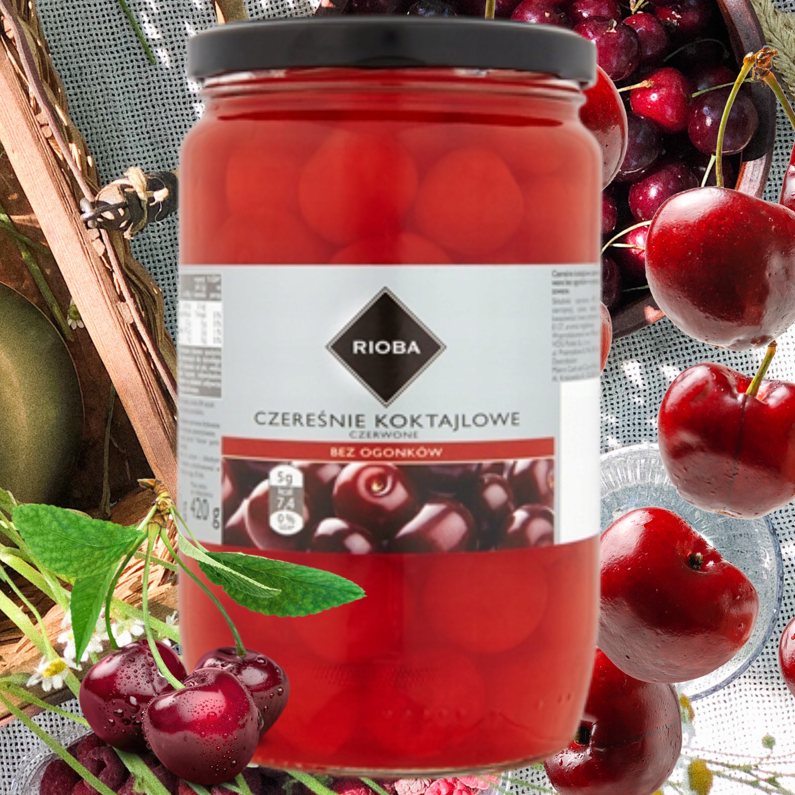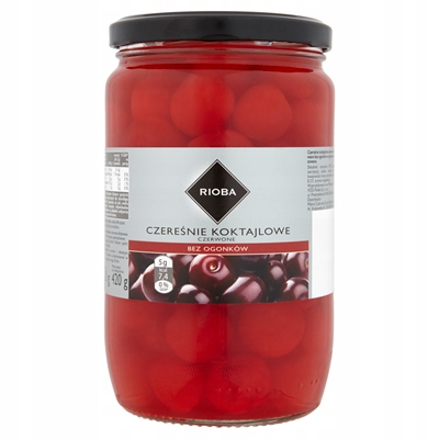 Czereśnie Koktajlowe Czerwone Bez Ogonków Rioba 750 g – Idealne do Drinków i Dekoracji